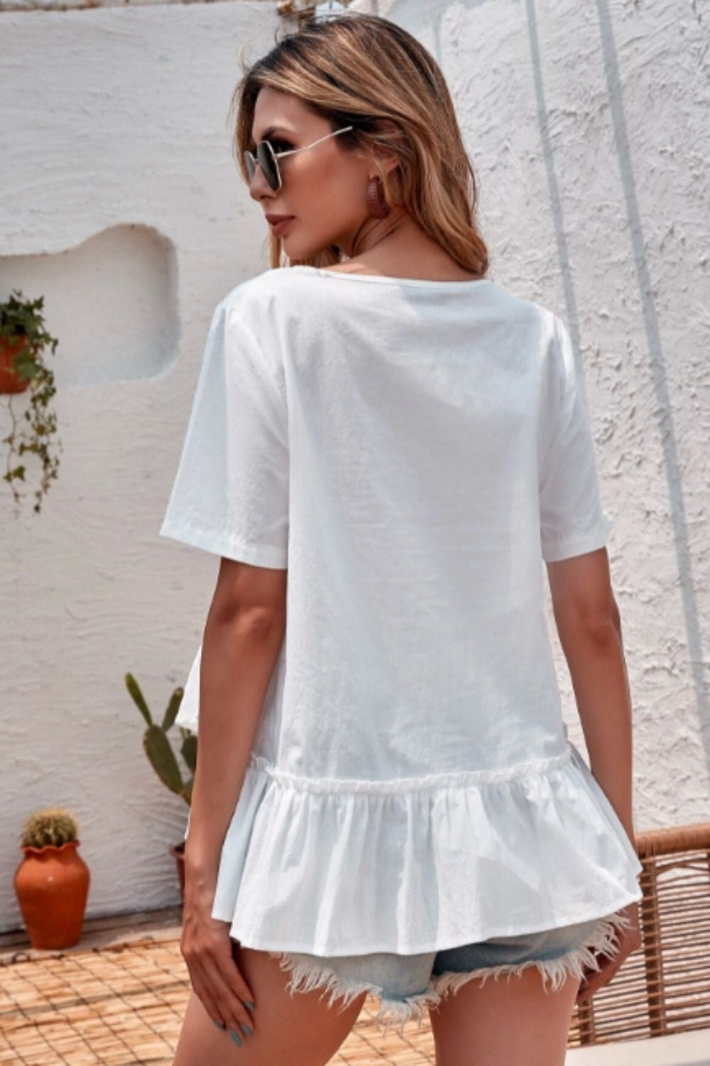 Type: Solid Frill Trim Asymmetrical Babydoll Blouse