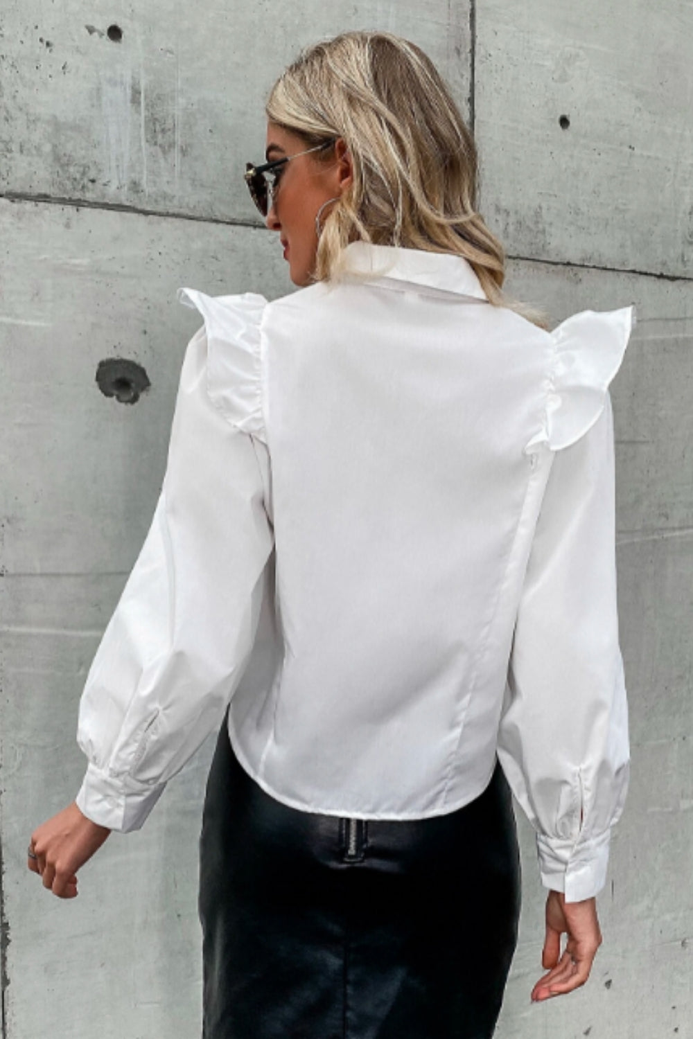 SKU:SolidRuffleTrimButtonUpBlouse-XS