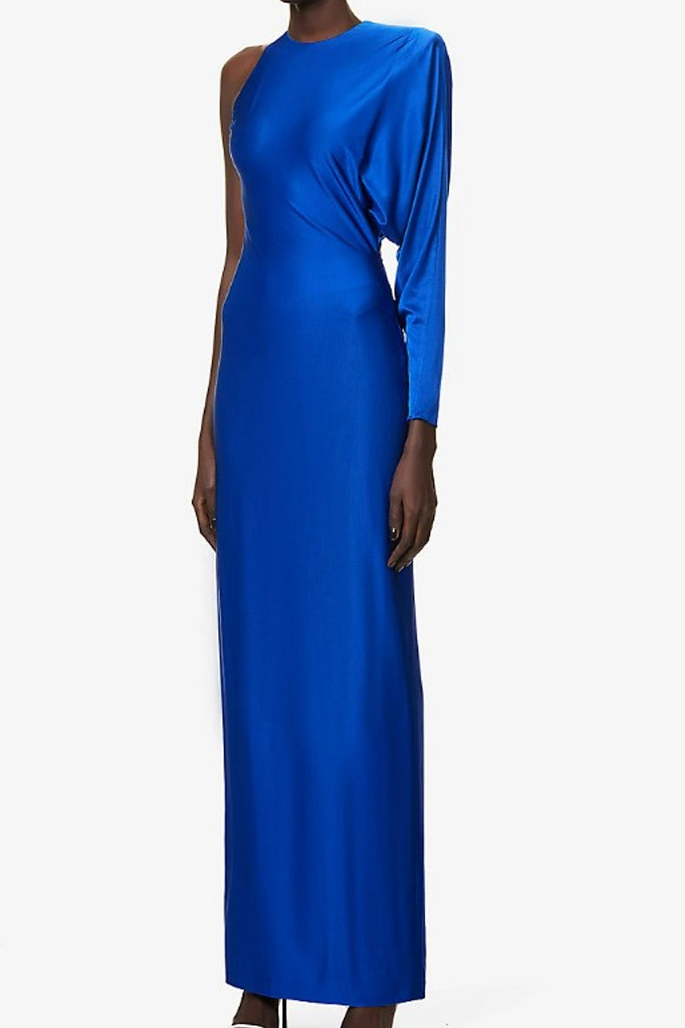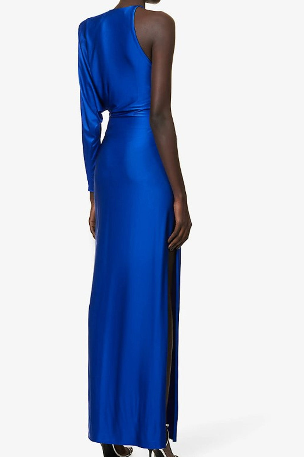 Type-Sonorous Blue Dress, Color-Blue, Neck type-Crew neck, Sleeve Length-full length, Fit-Body Fit, Fabric-Satin