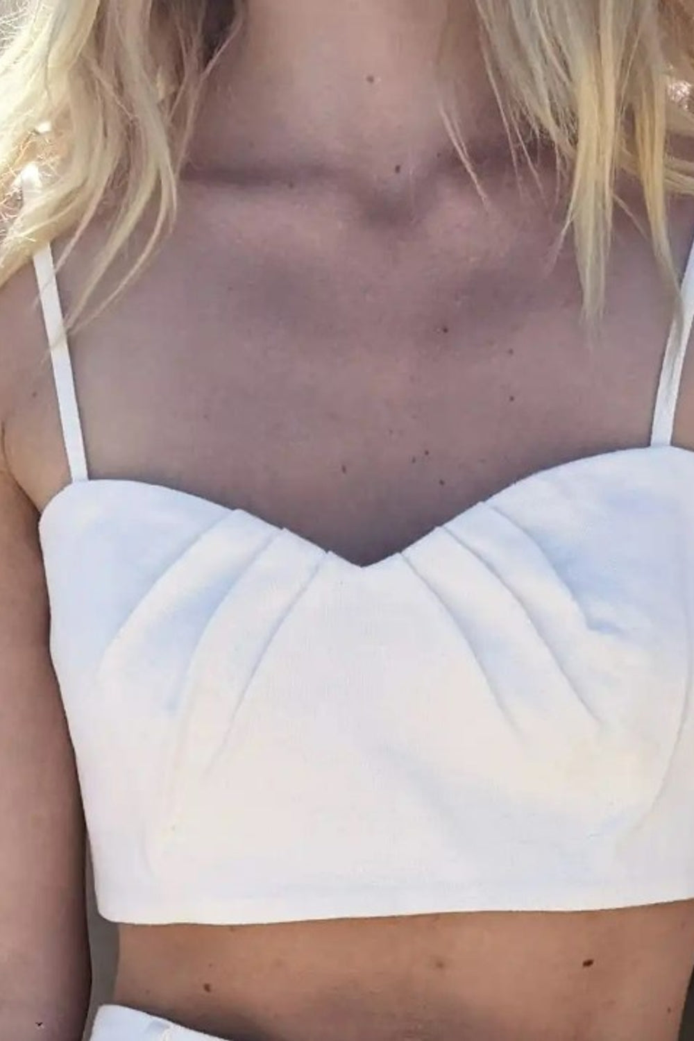 Type-Sparkly White Top, Color-White, Neck type-Sweetheart neck, Sleeve Length-Sleeveless, Fit-Body Fit, Fabric-Poplin