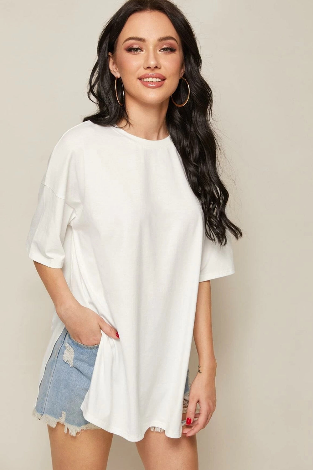 DETAILS- Long length, Drop shoulder, extended sleeves, side slit