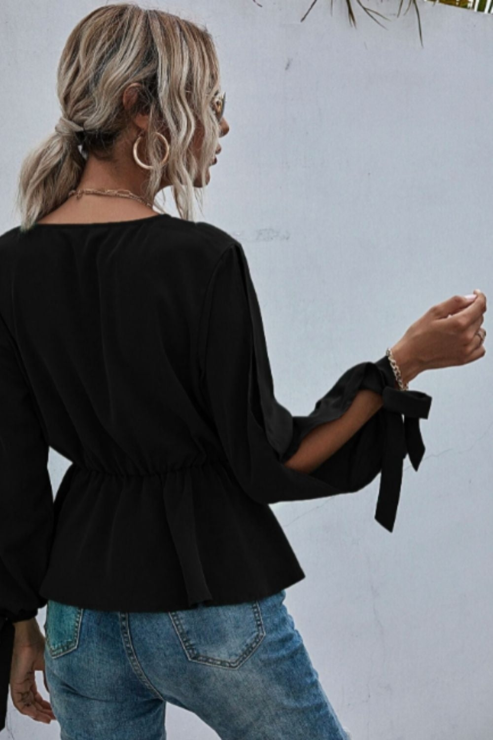 Split Sleeve Tie Cuff Peplum Blouse