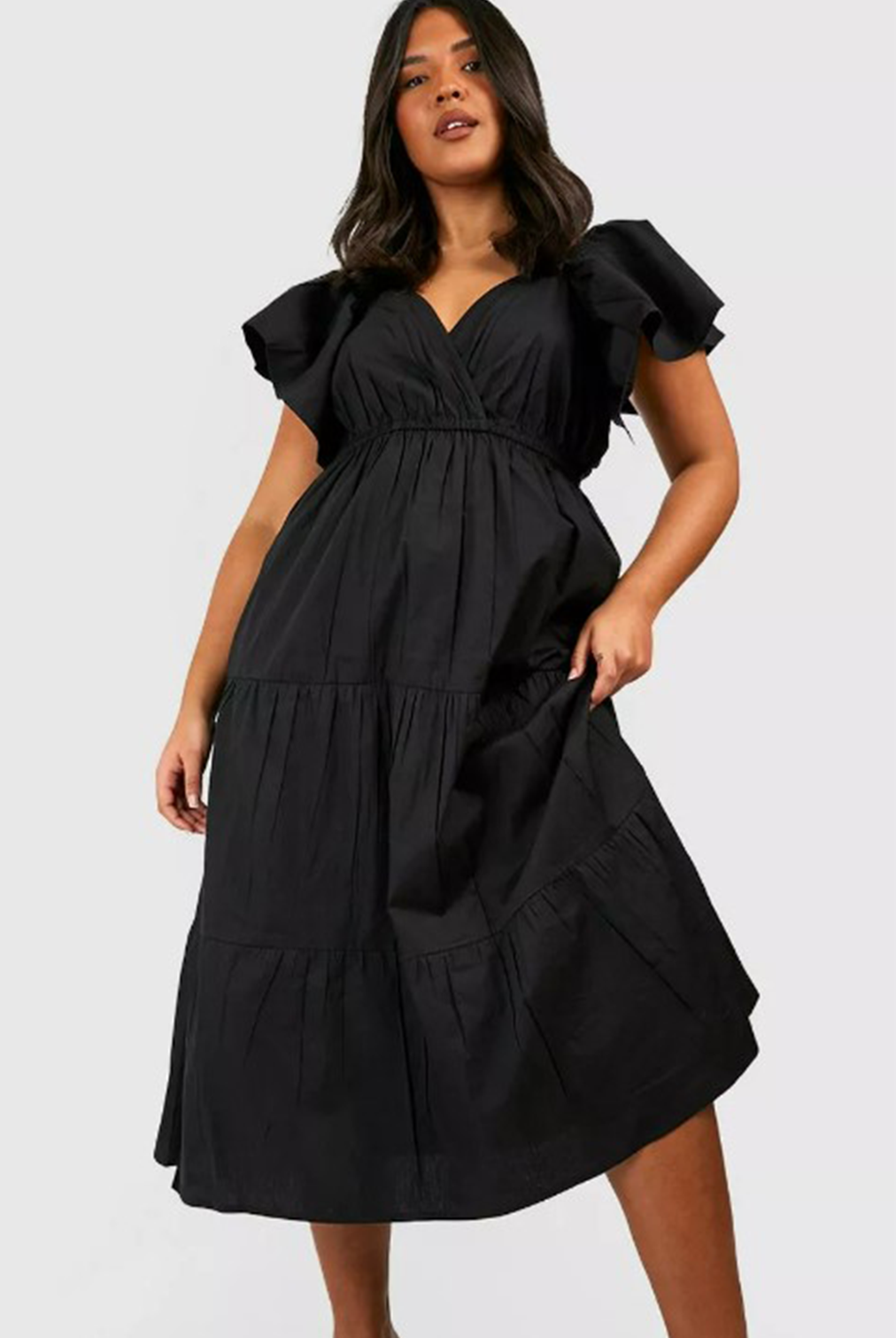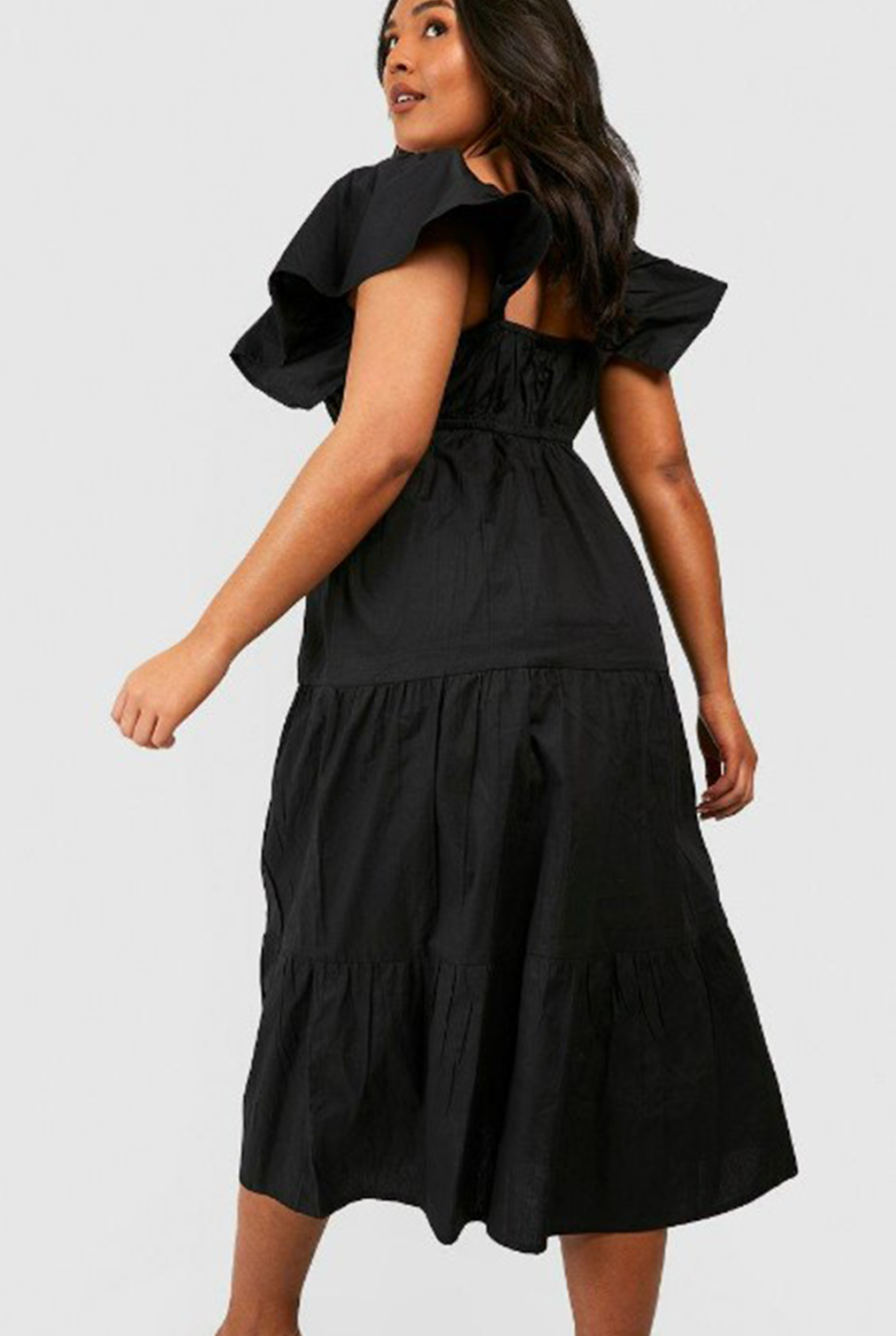Type-Spry Black Dress, Color-Black, Neck type-V Neckline, Sleeve Length-Ruffle Cap sleeve, Fit-Regular, Fabric-Poplin