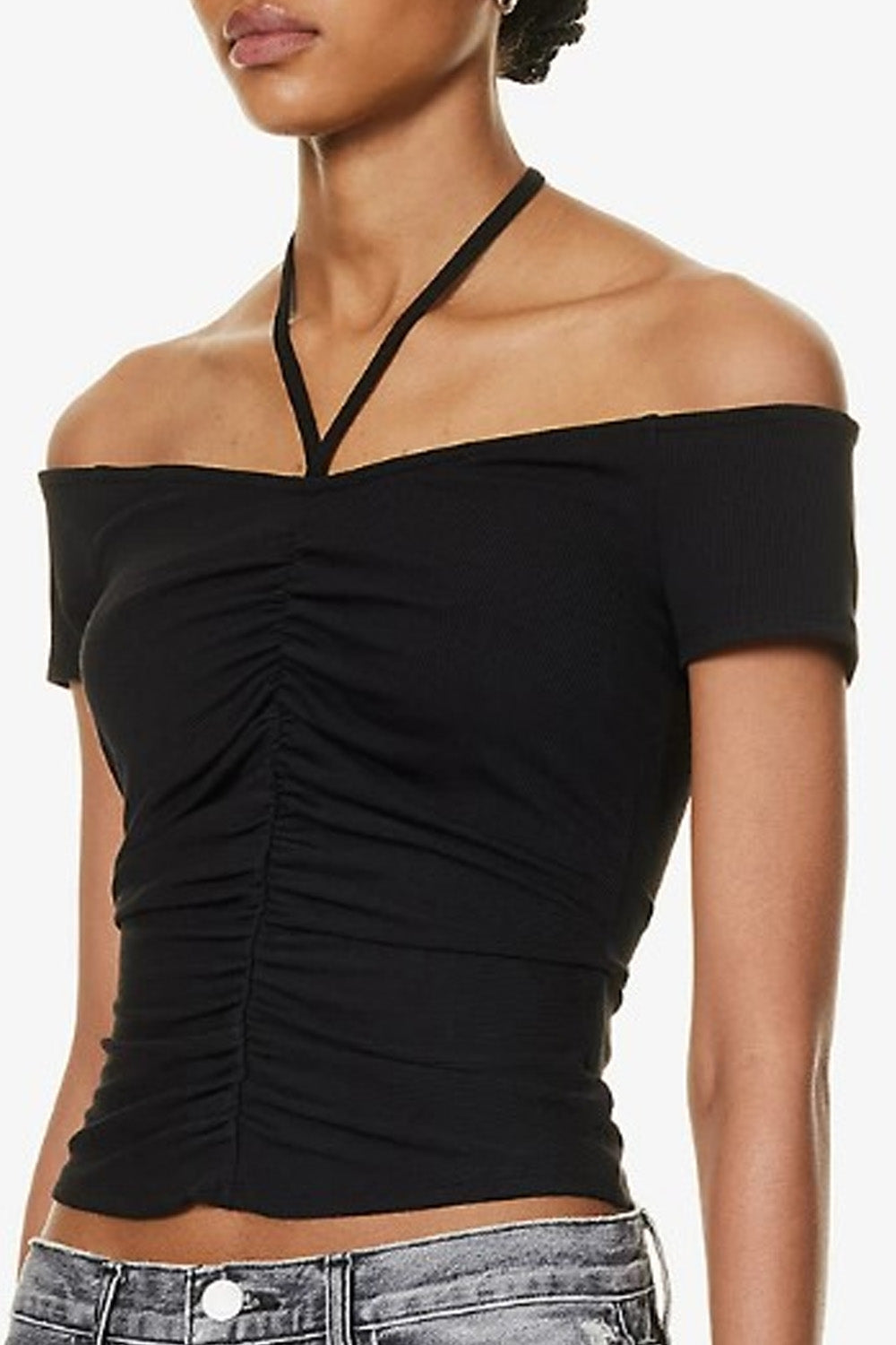 Type-Susurrus Black Top, Color-Black, Neck type-Halter neck, Sleeve Length-Short sleeve, Fit-Body Fit, Fabric-Poly Lycra