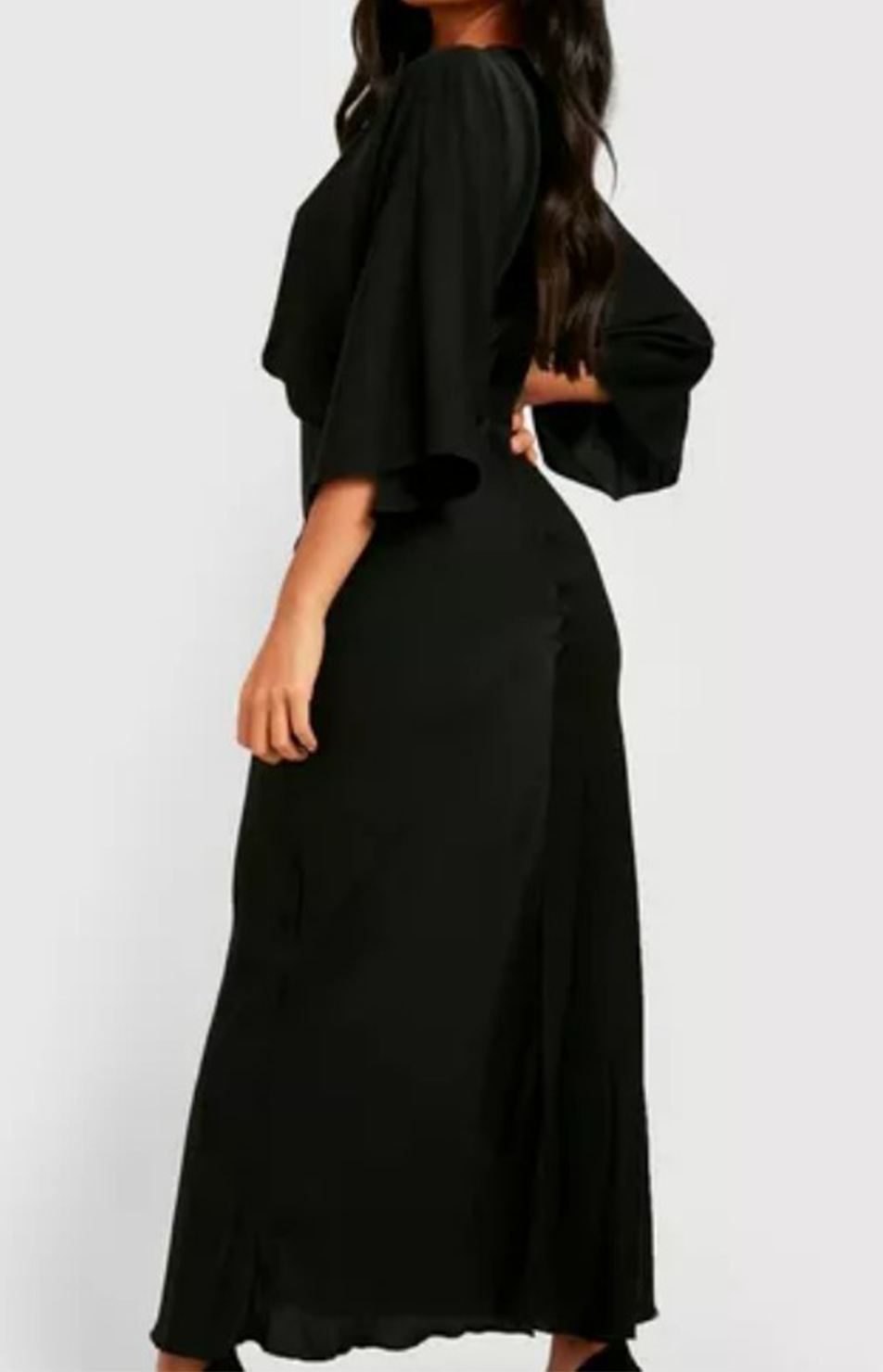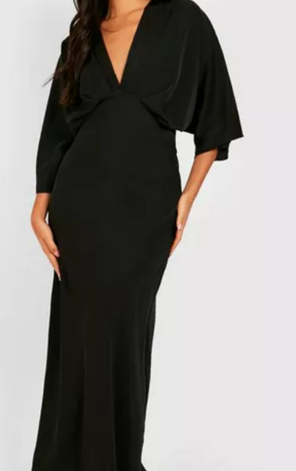Type-Swanky Black Dress, Color-Black, Neck type-Deep V neck, Sleeve Length-Below elbow length, Fit-Body Fit, Fabric-Poly Lycra