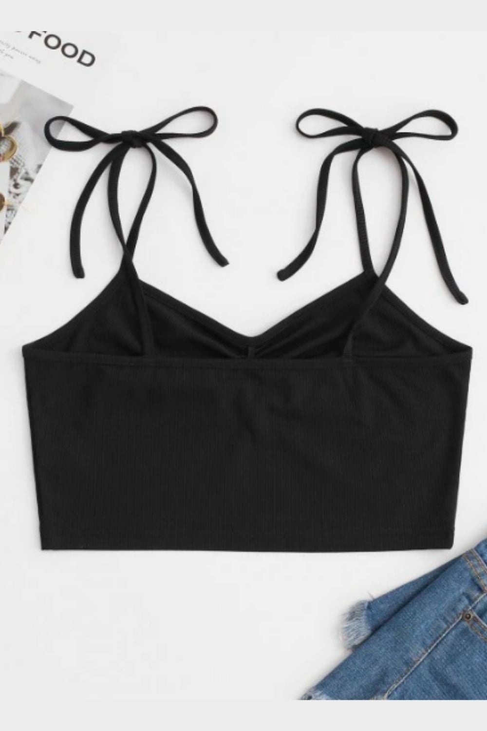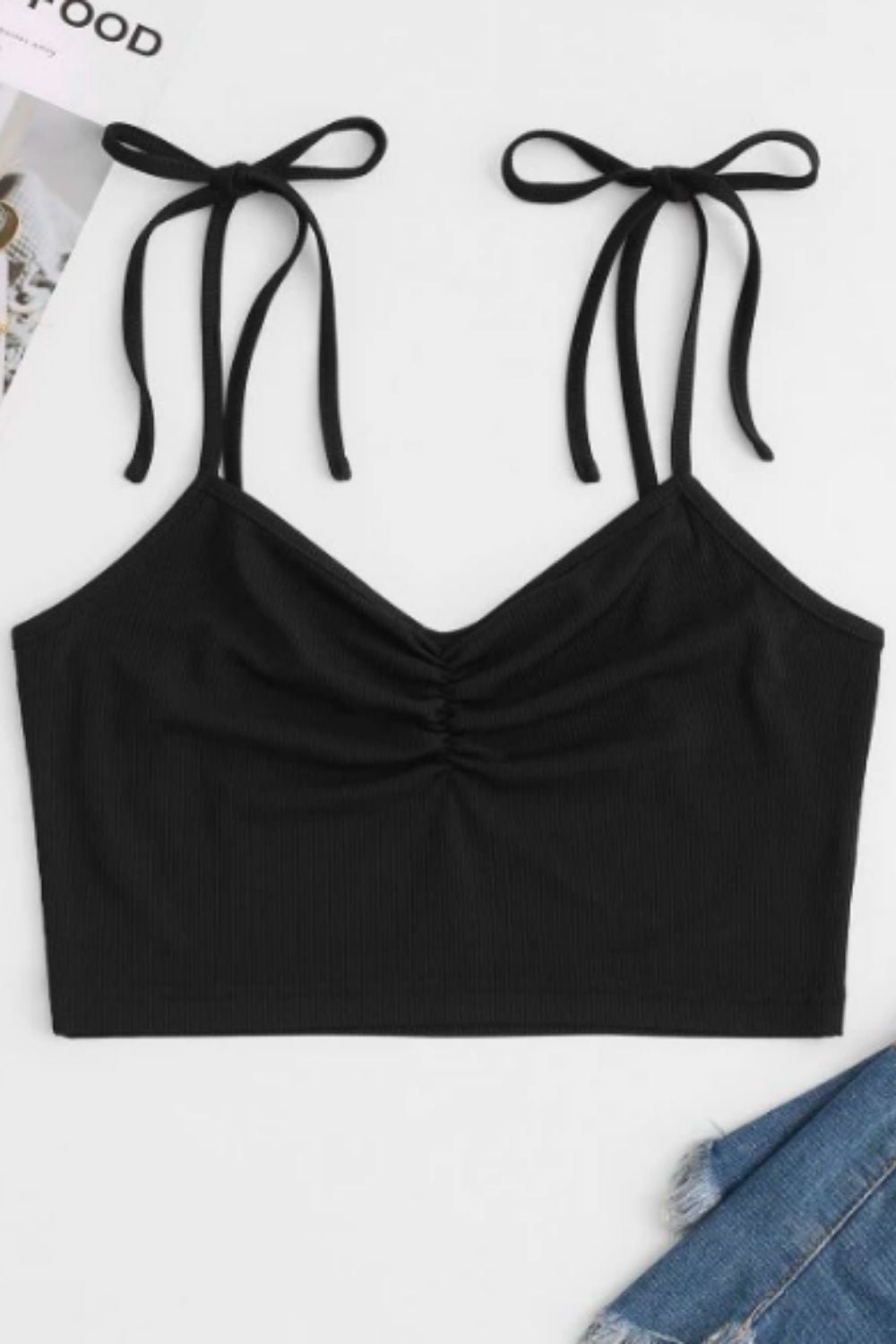 Whether you're heading to a brunch with friends, a casual day out, or a night on the town, the Tie Shoulder Rouched Cami Top is your go-to choice for a chic and stylish look.
