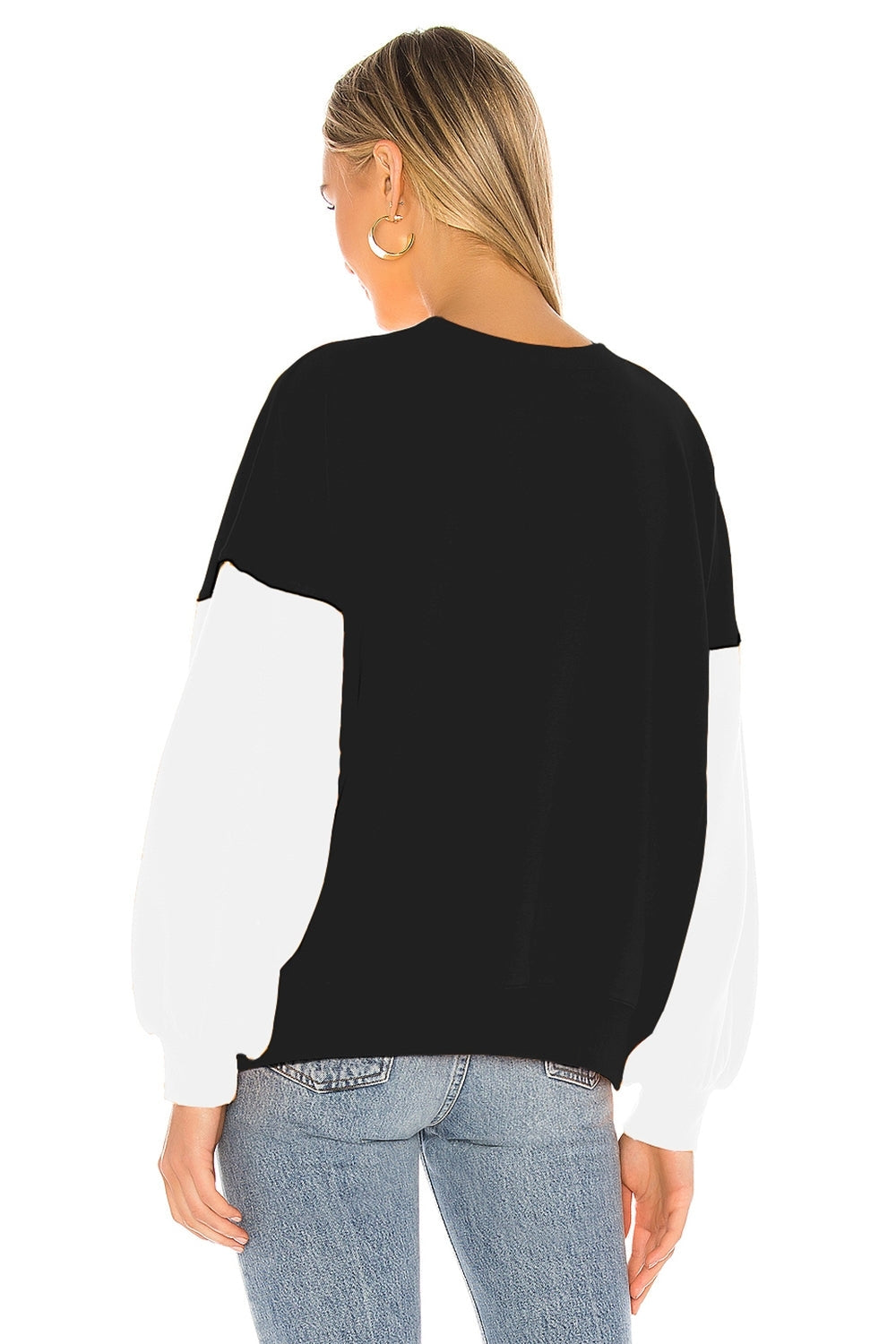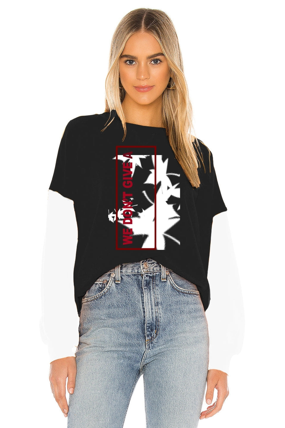 The graphic print placed at the front grabs the attention of the onlookers for its bold and eye catching feature. This top has a round neck and dropped shoulder with long sleeves in contrast fabric to create a color block. The top is made from jersey fabric.