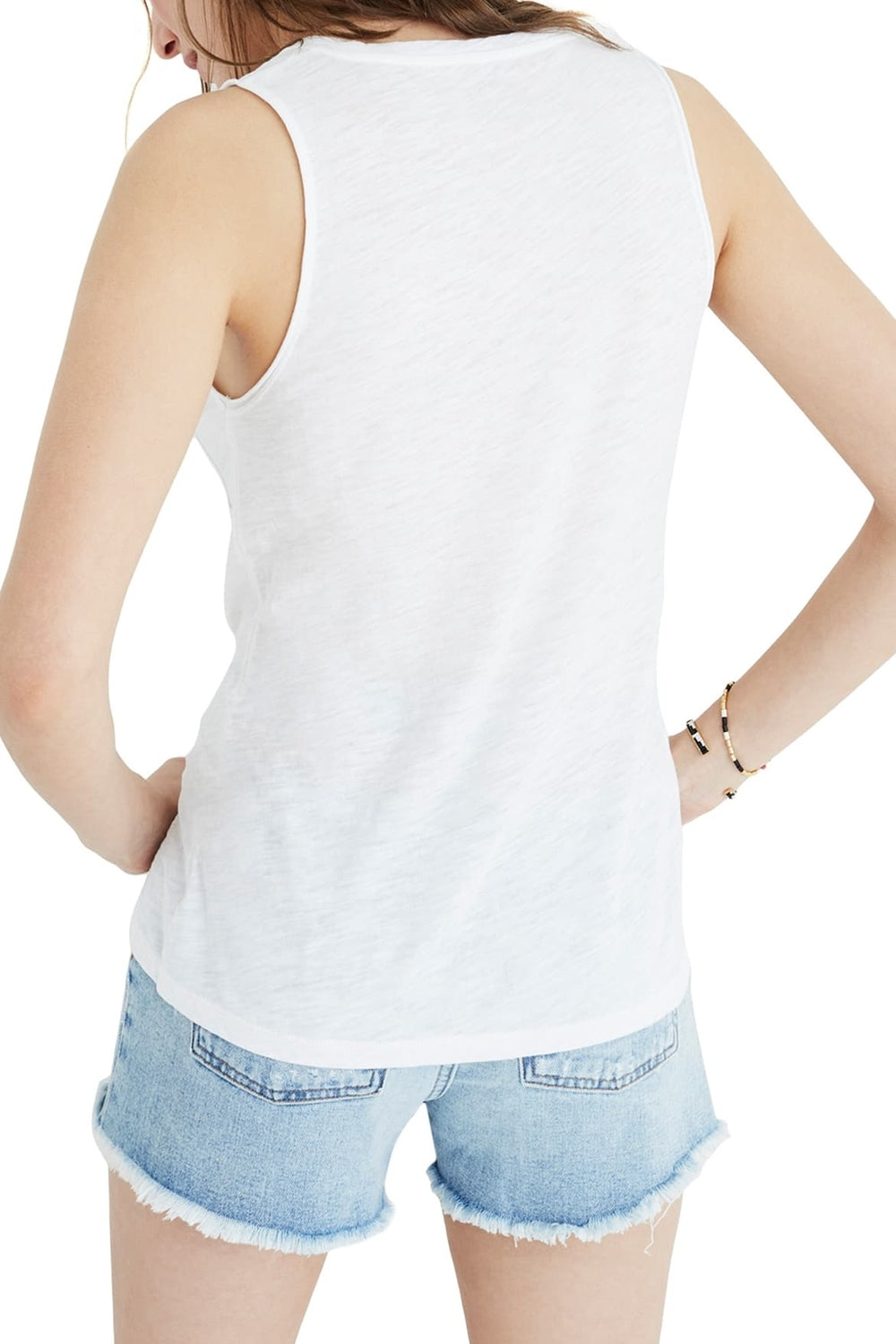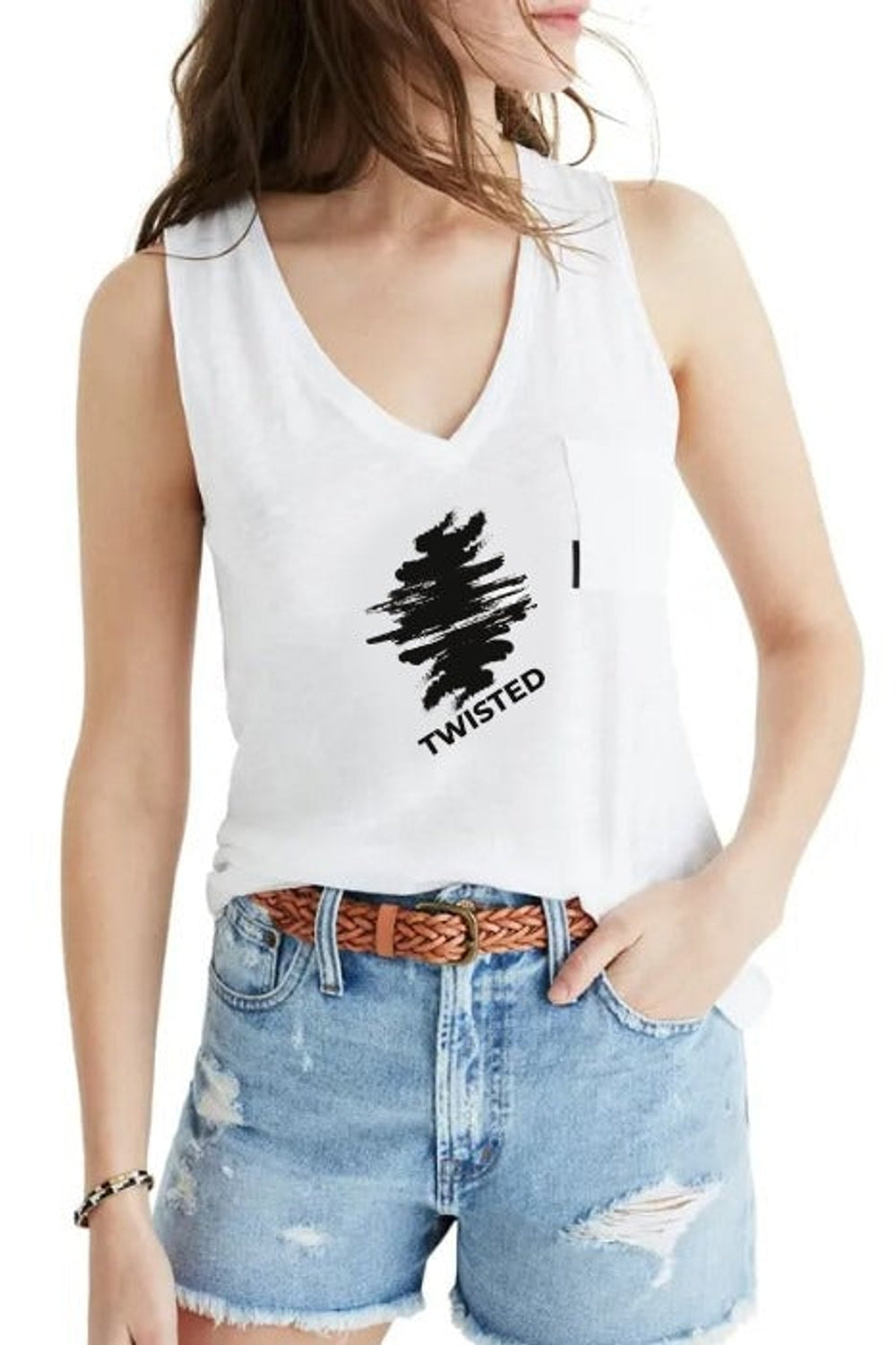 The basic sleeveless top has a V-neckline and a pocket that sits at the side. A graphic print is placed at the front. This top is made from jersey fabric.