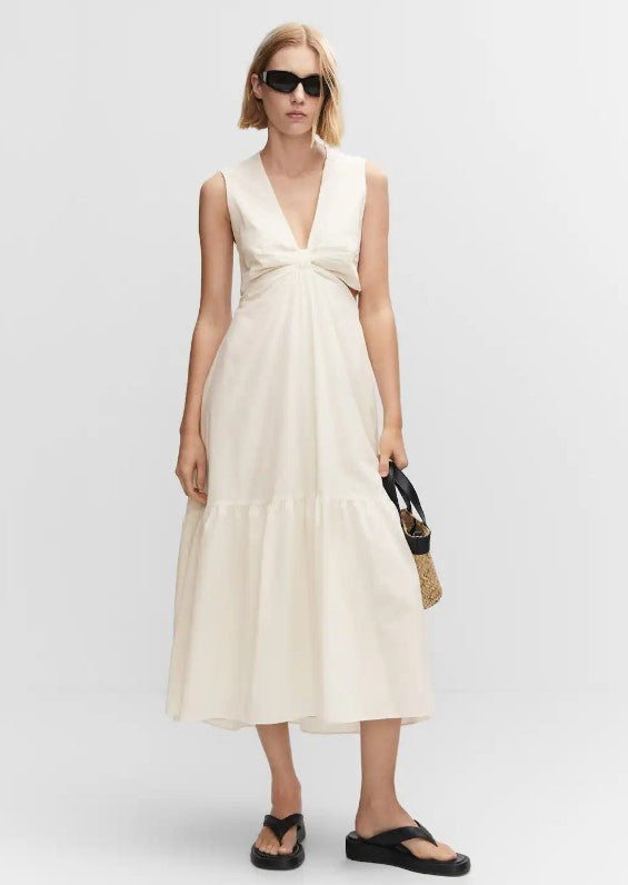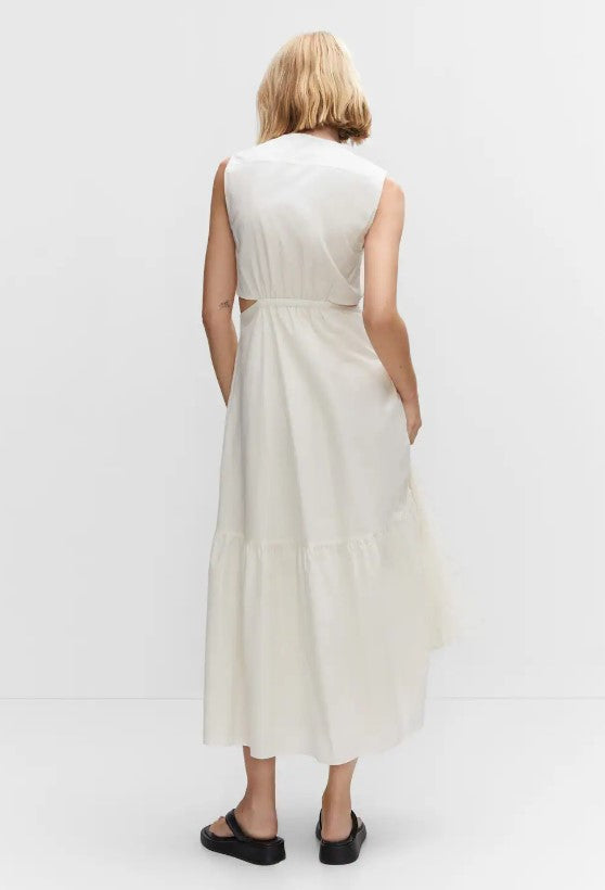 Type-Ulyanovsk Off White Dress, Color-Off White, Neck type-V Neck, Sleeve Length-Sleeveless, Fit-Slim, Fabric-Poplin