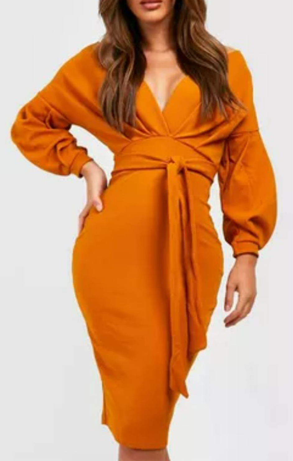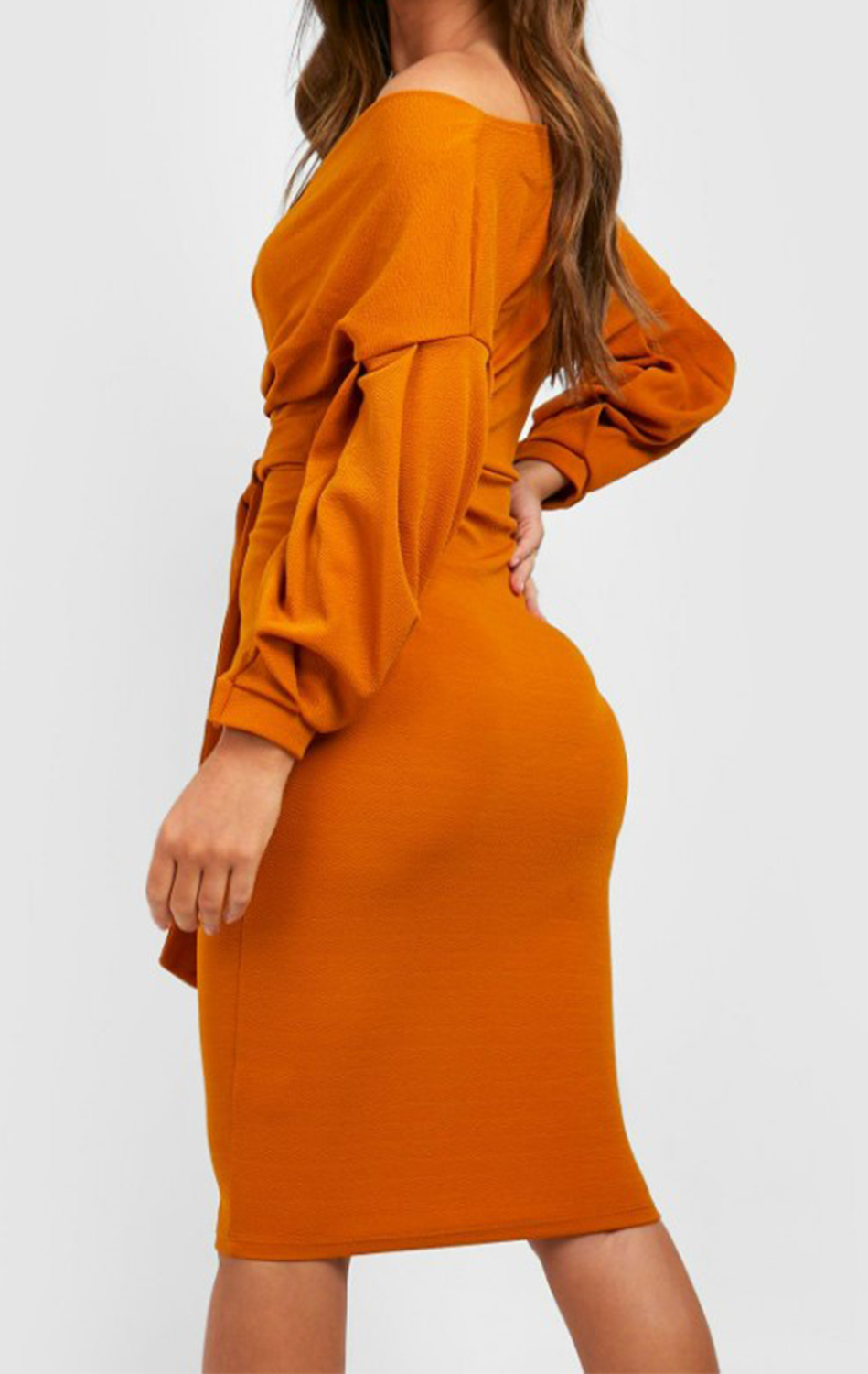 Type-Unconventional Orange Dress, Color-Orange, Neck type-Off-Shoulder neck, Sleeve Length-full length, Fit-Body Fit, Fabric-Poly Lycra