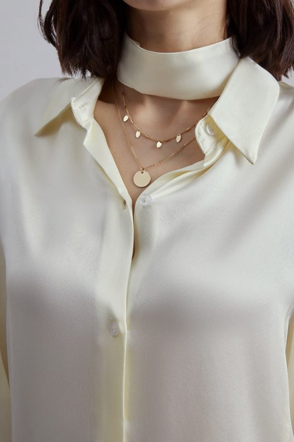 Embrace effortless style with our fashion styling tips for the V-Neck Scarf Collar Silk Blouse Top: