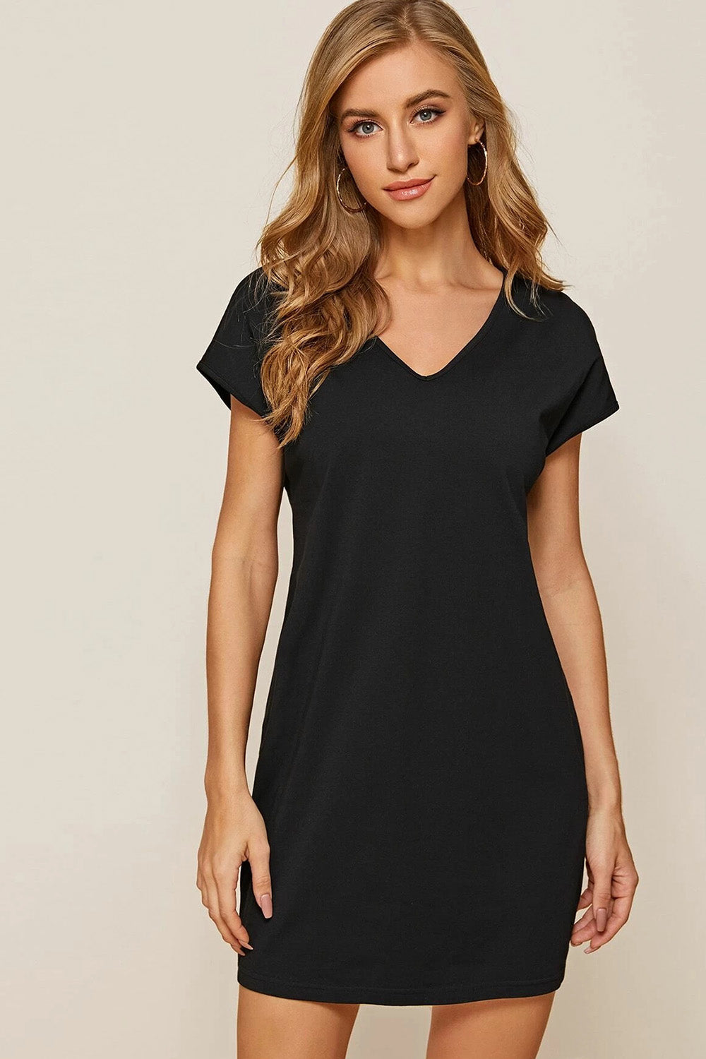 Whether you are staying in or going out, this t-shirt dress is comfortable to wear all day long. NAME- V neck solid tee dress