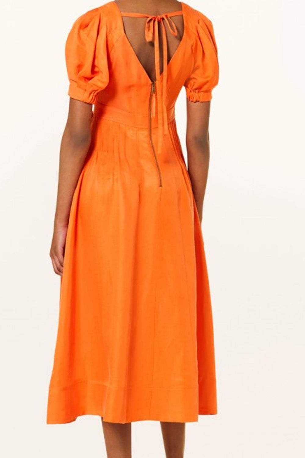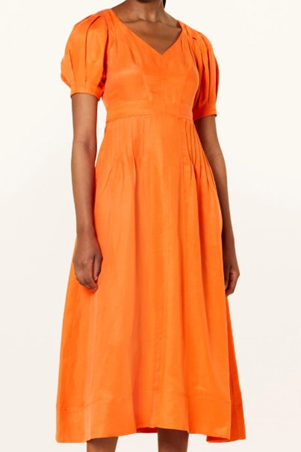 Type-Verdure Orange Dress, Color-Orange, Neck type-V neck, Sleeve Length-Half Sleeve, Fit-Regular, Fabric-Satin
