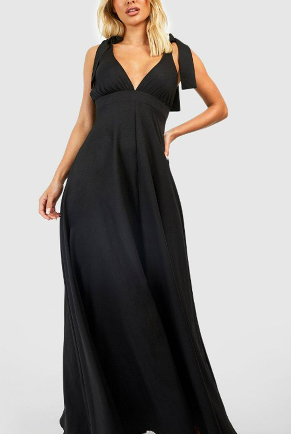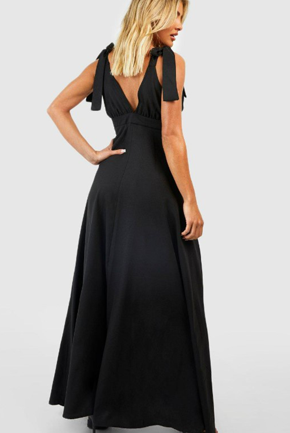 Type-Whimsy Black Dress, Color-Black, Neck type-V Neckline, Sleeve Length-Sleeveless, Fit-Regular, Fabric-Satin Lycra