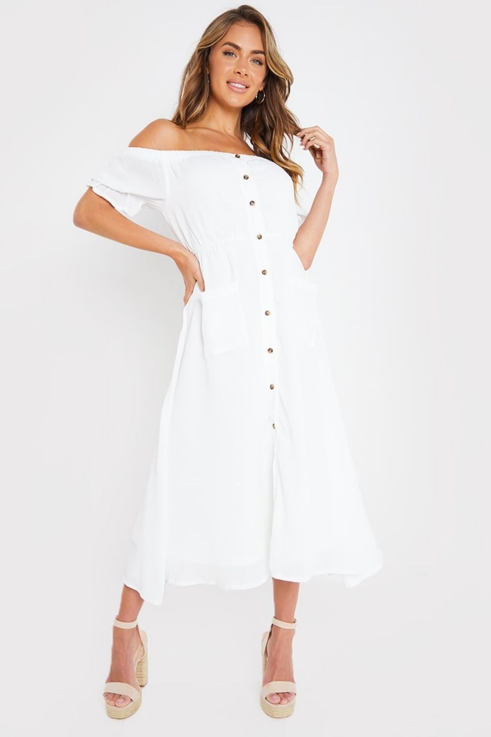 SKU:WhiteBardotPocketDetailMidiDress-XS