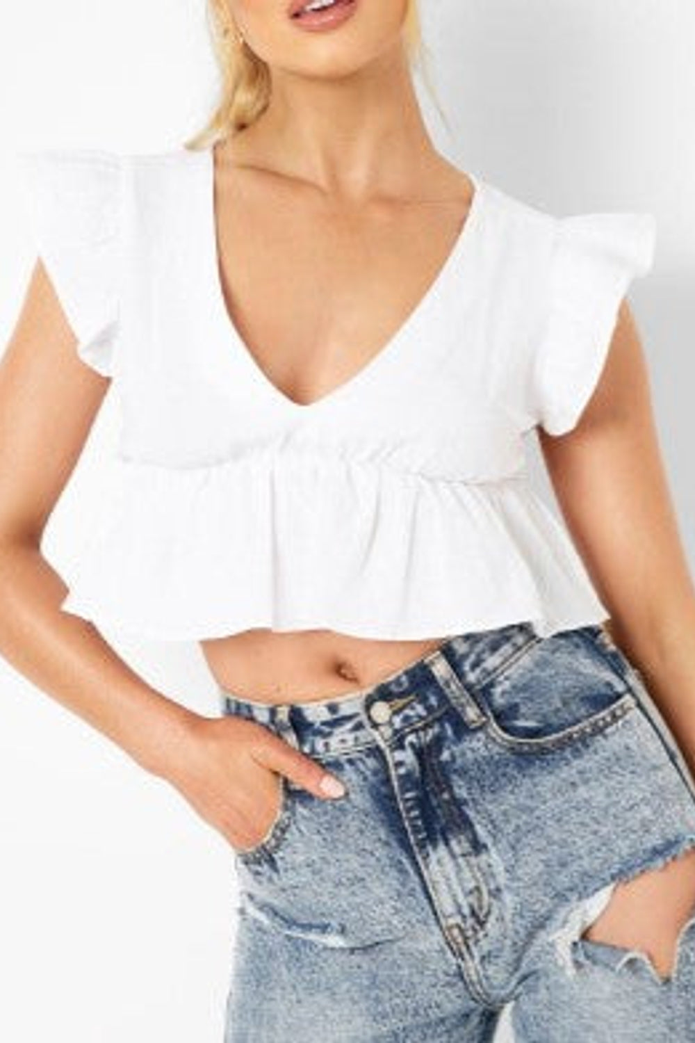 The classic white hue of this top exudes timeless elegance, while the V-neckline and ruffle sleeves add a feminine flair that's perfect for any summertime soiree. The cropped length and peplum silhouette create a flattering fit that accentuates your waistline, giving you a chic and polished look.