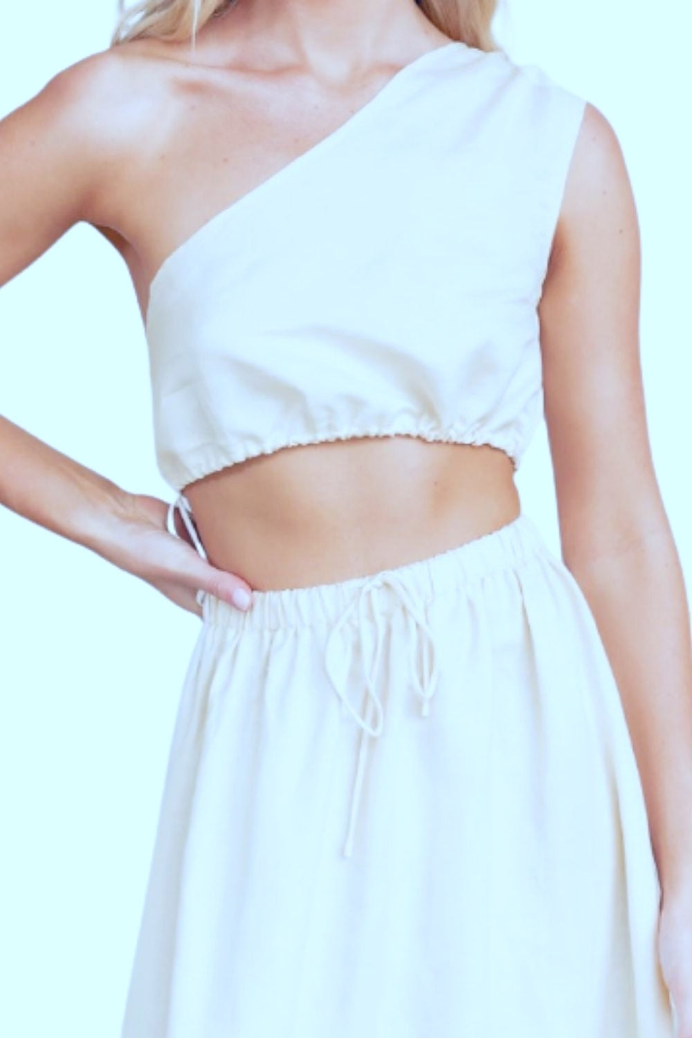 Embrace the breezy vibes of summer with our White Windy Drawstring Top. Crafted from premium poplin fabric, this sleeveless top offers both style and comfort, making it a must-have addition to your wardrobe. Its asymmetric neckline adds a touch of uniqueness, while the drawstring detail allows you to adjust the fit according to your preference.