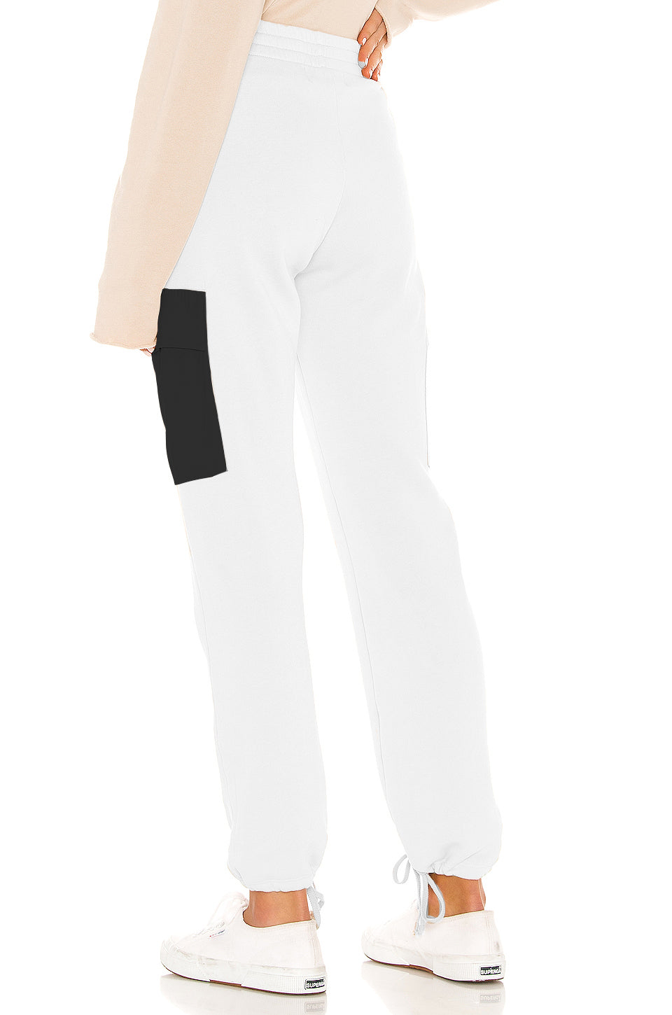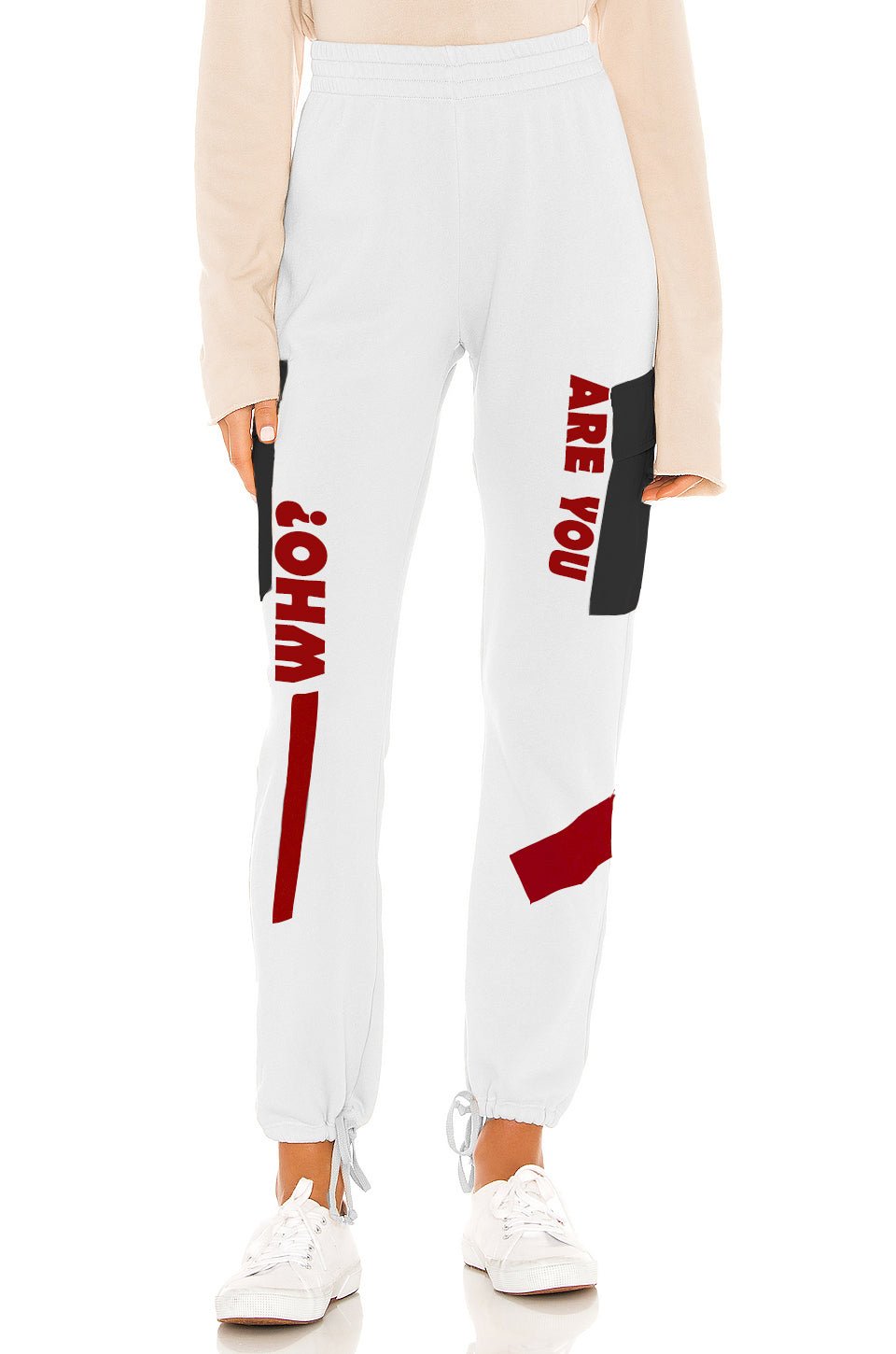 A basic white pair of joggers with a tie at the cuffs has several patches with text print bringing the design together to create a unique look. The design is made from jersey fabric.
