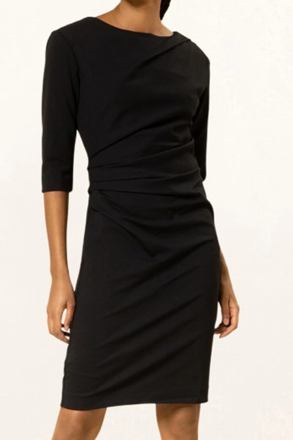 Type-Wooded Black Dress, Color-Black, Neck type-Crew neck, Sleeve Length-Below elbow length, Fit-Body Fit, Fabric-Poly Lycra