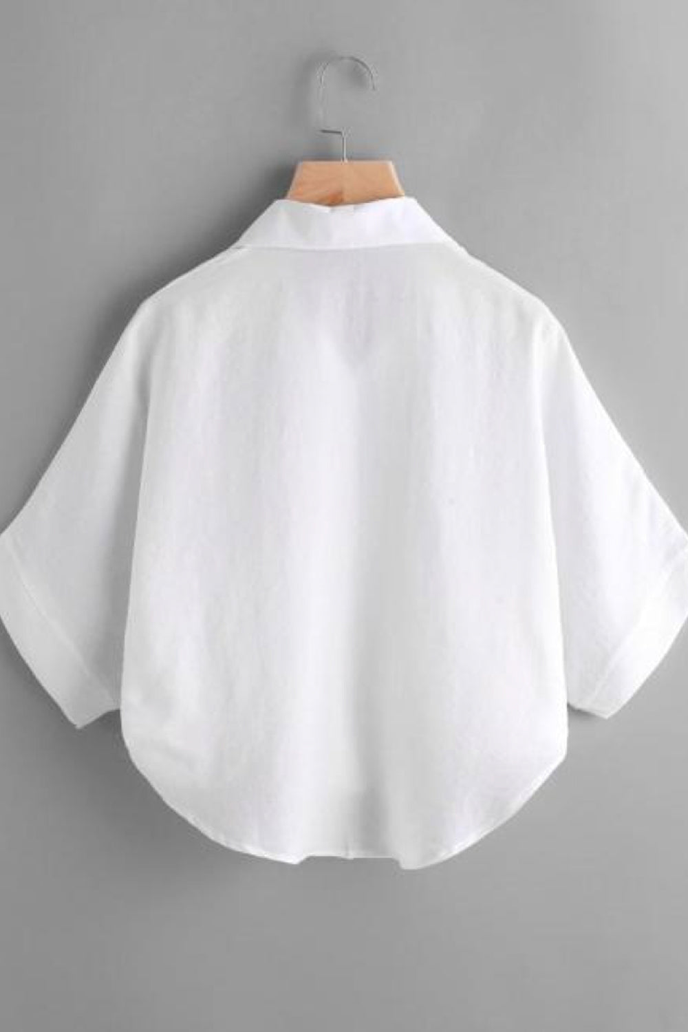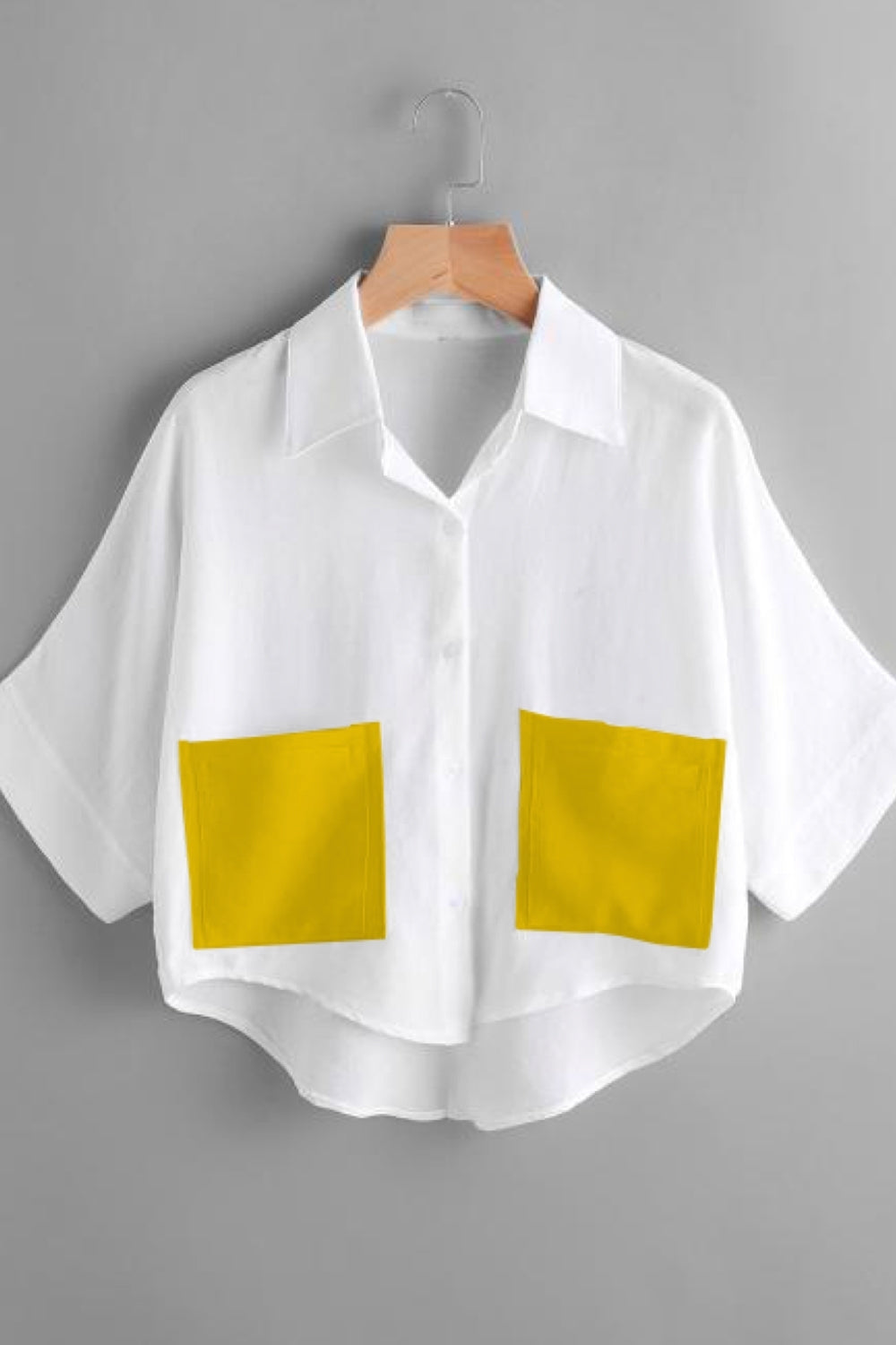 Looking for trendy tops? We’ve got you covered! Check out this white crop length shirt with contrast pockets. Ocre yellow dual pockets makes it look refreshing and can be worn with colourful bottoms! Made from poly-cotton fabric.