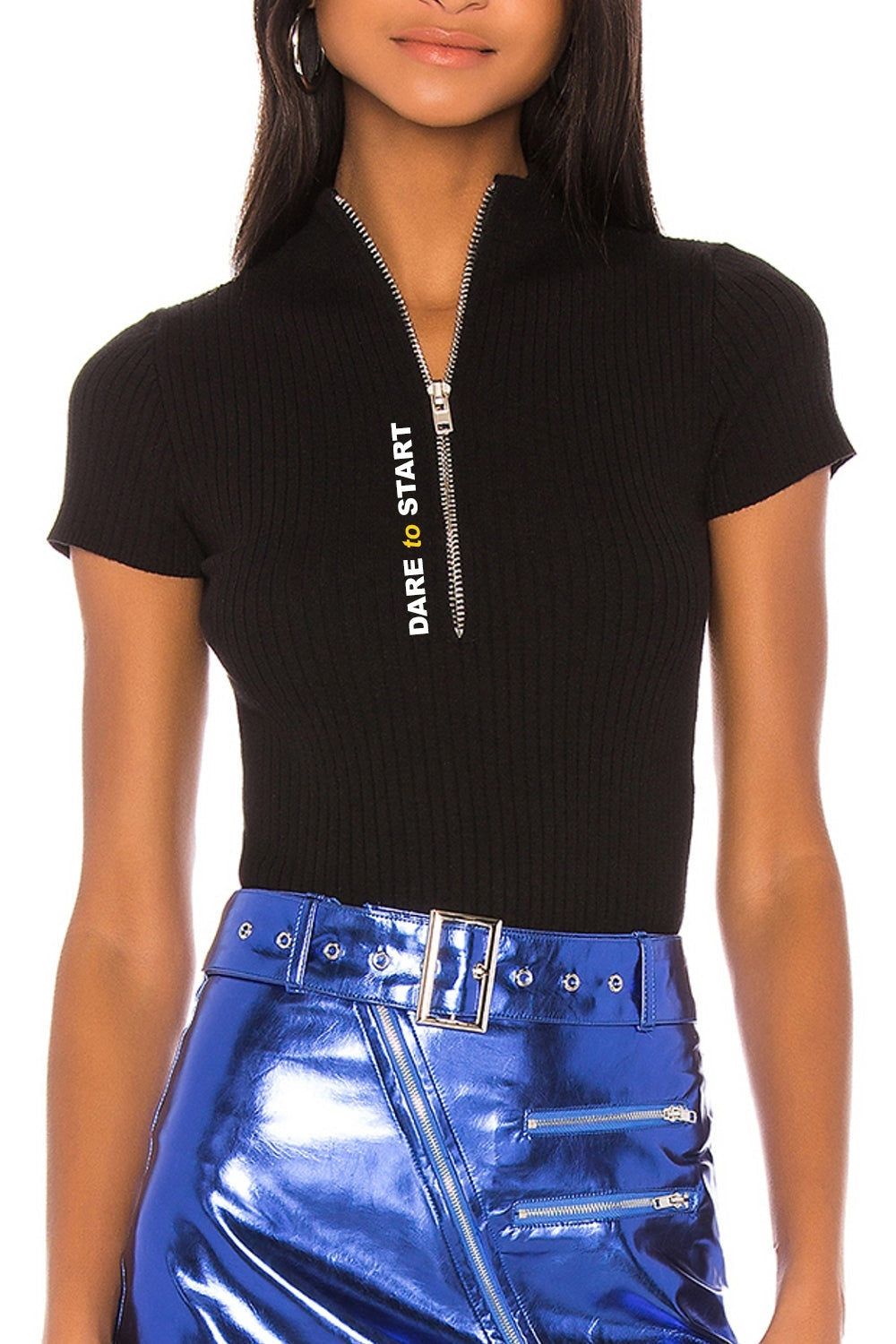 This pretty looking top is a design inspired by self-love to explore your beautiful thoughts with a elegant look. This top has half sleeve and extended collar. Made of rib knit, having design features as front zip, digital print are going to add more trendy and unique style to your look.